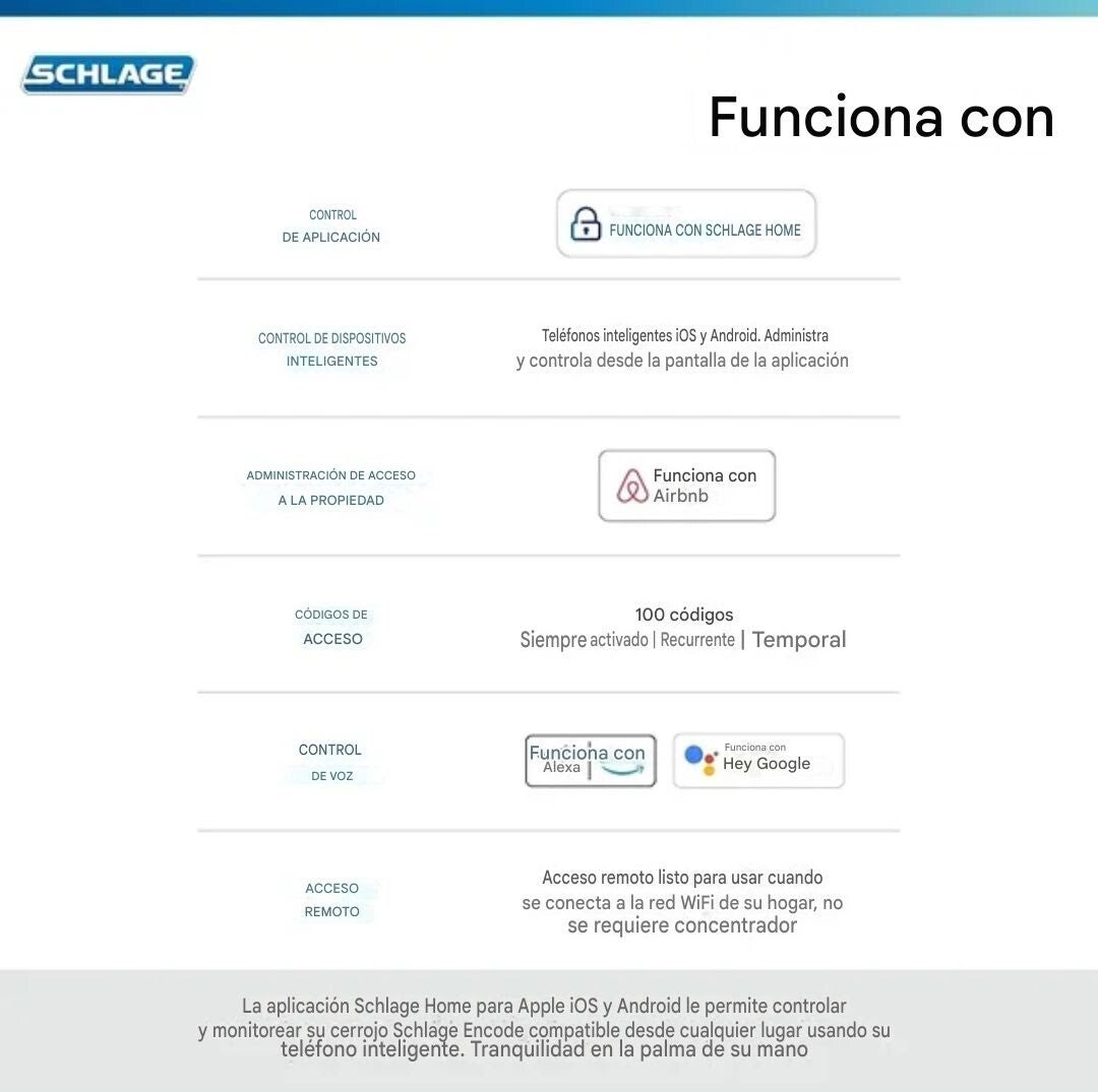 TRANQUILIDAD: Bloquea y desbloquea desde cualquier lugar, gestiona hasta 100 códigos de acceso, consulta el historial de bloqueos, recibe notificaciones personalizables y gestiona fácilmente varias cerraduras a la vez, todo ello al vincularla con la aplicación Schlage Home y conectarla a una red Wi-Fi segura.